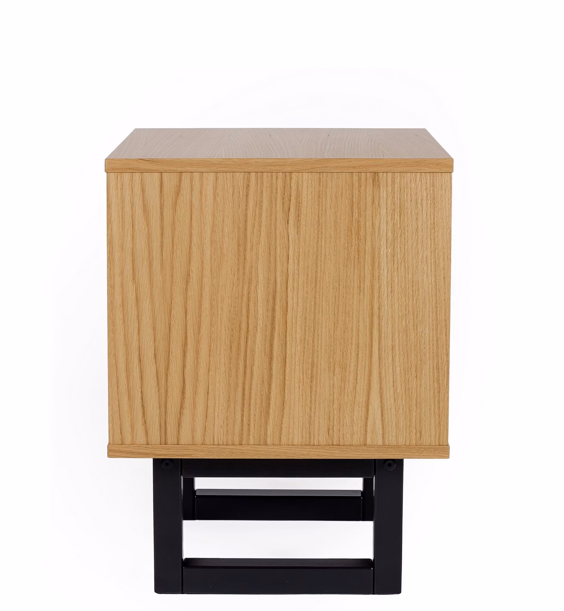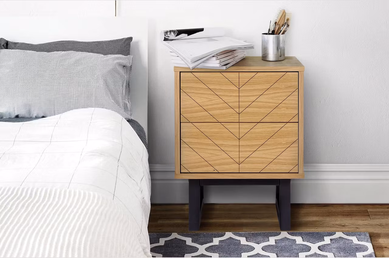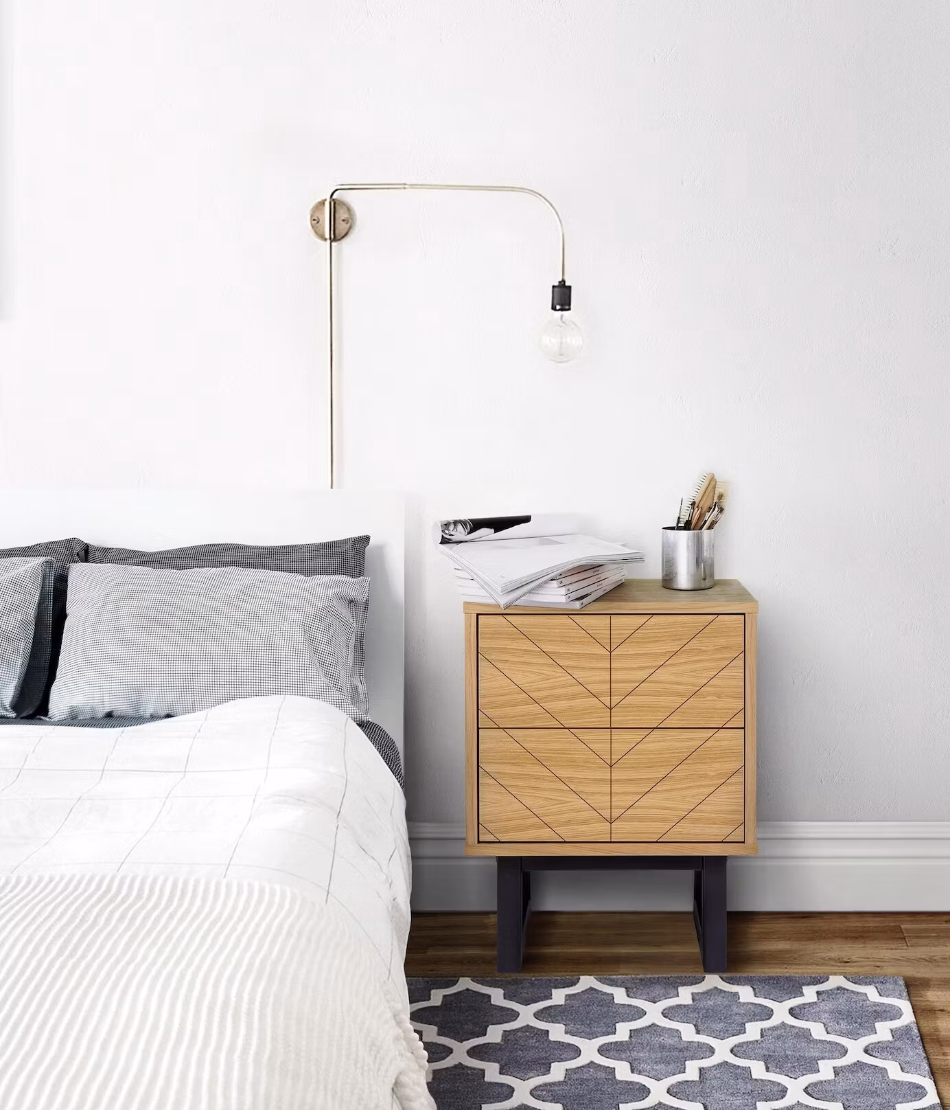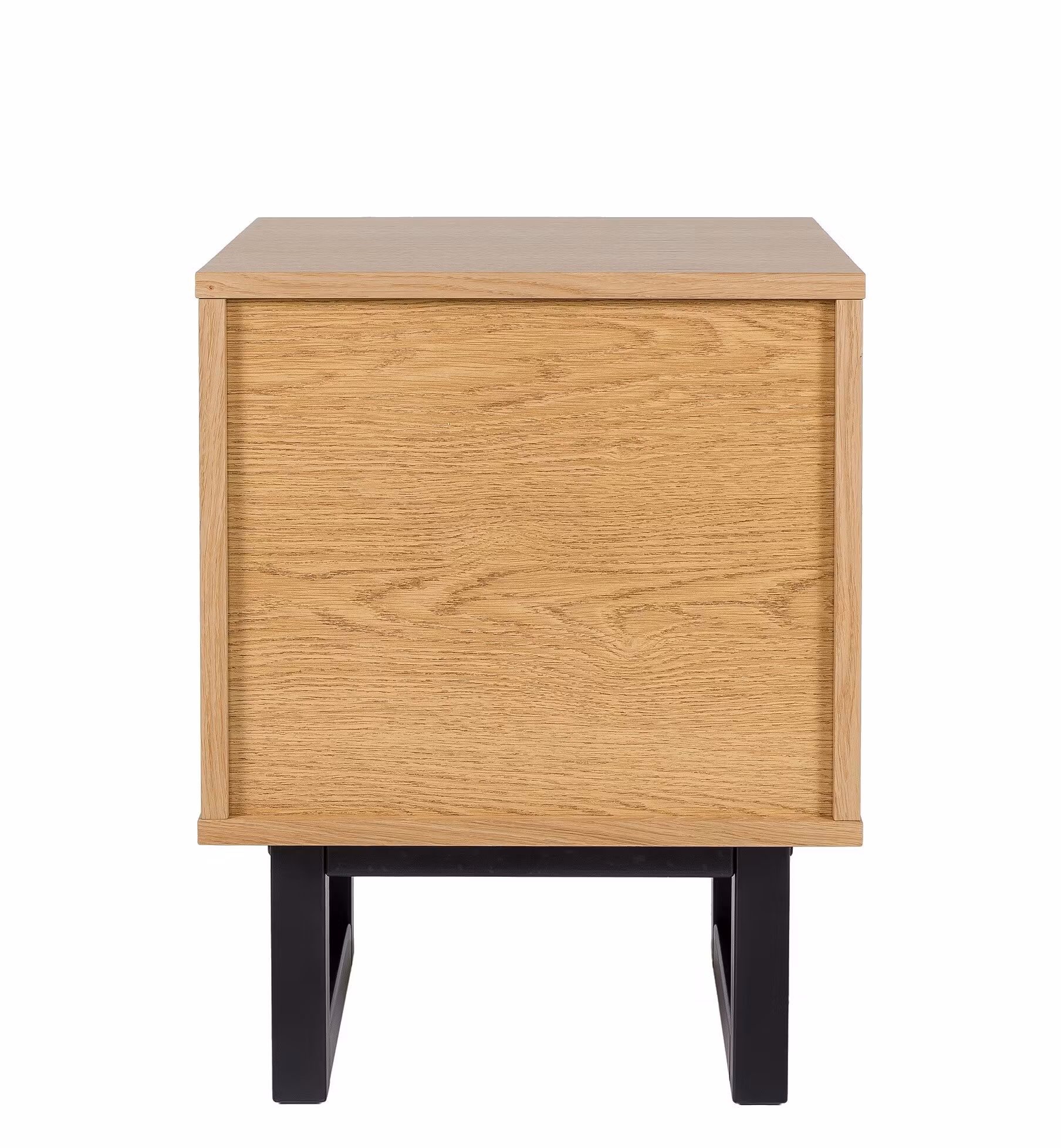 CAMDEN HERRINGBONE PRINT Sängbord. Ek fanér (stomme och front), klar lack, ett tryck mönster • massiv trä ben lackats i matt svart • push-to-open funktion.
