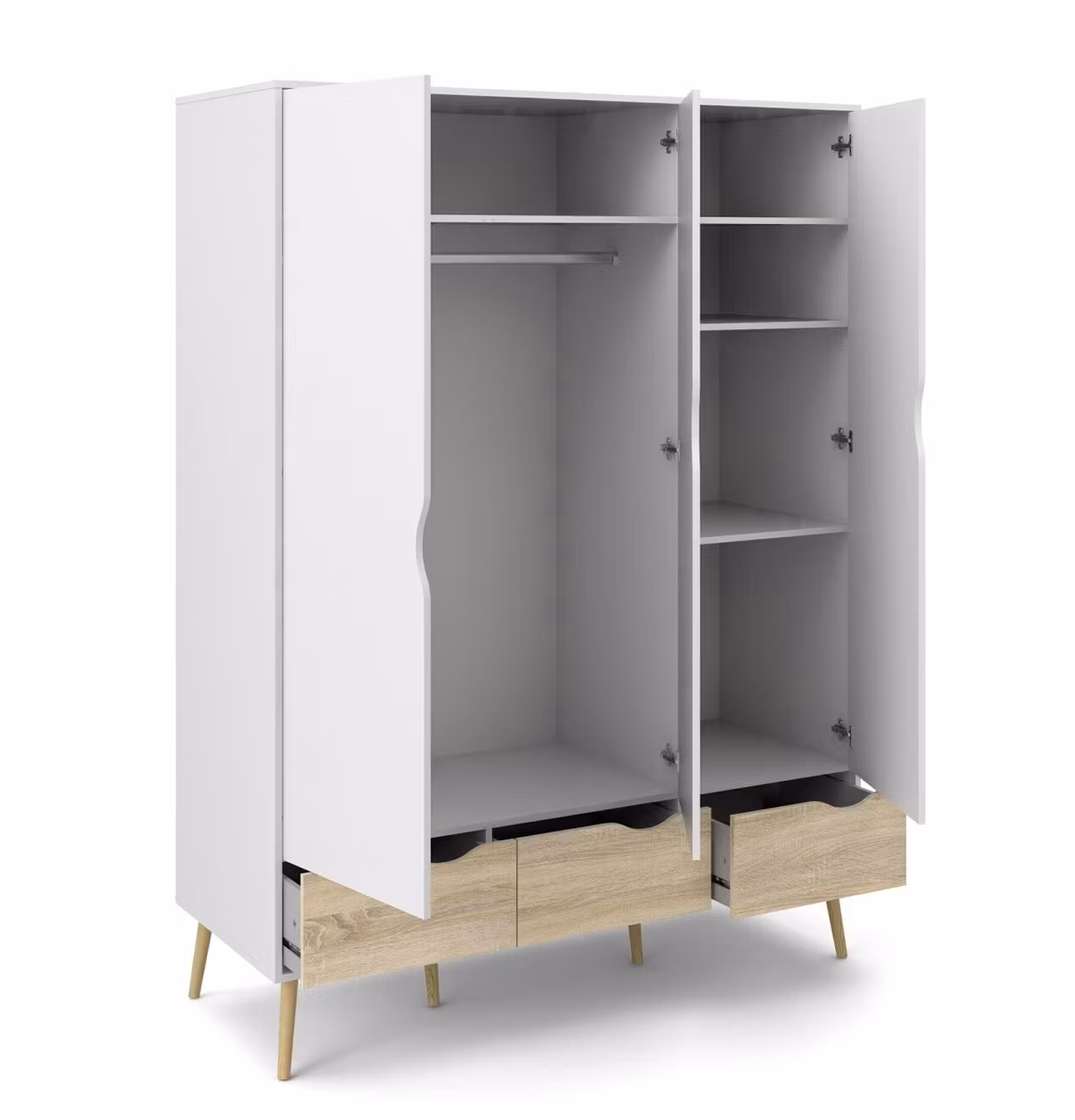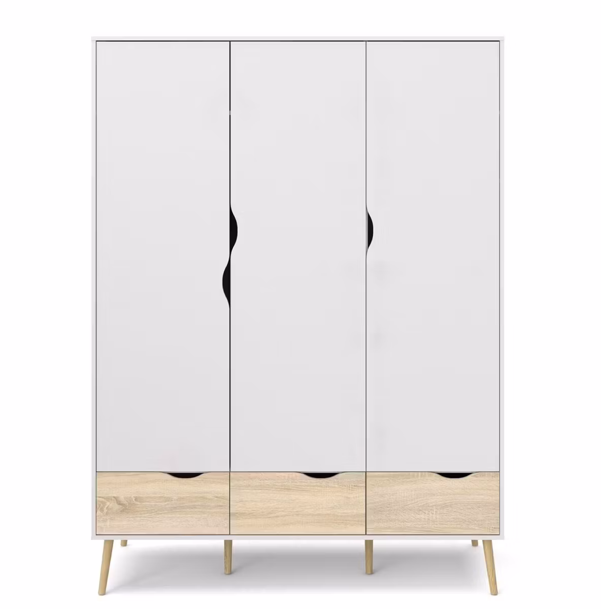 Garderob med 3 dörrar och 3 lådor. Höjd: 200 cm, bredd: 147,5 cm, djup: 58 cm. Basmaterial: möbelskiva, finishfolie. Färg: vit/ek.
