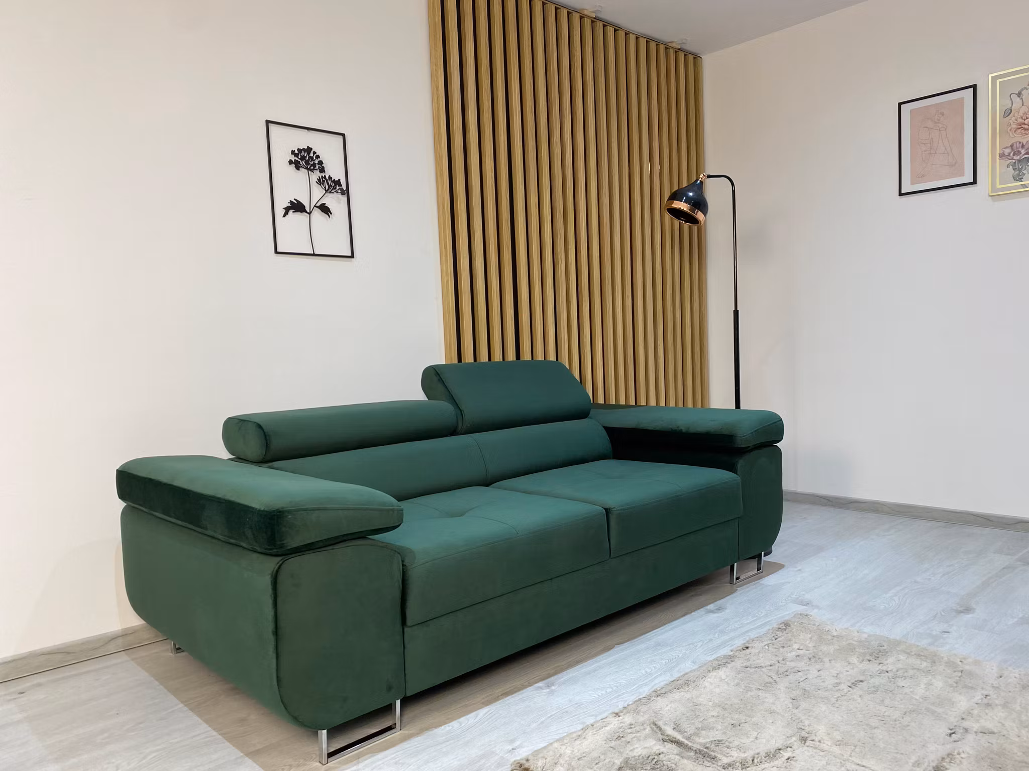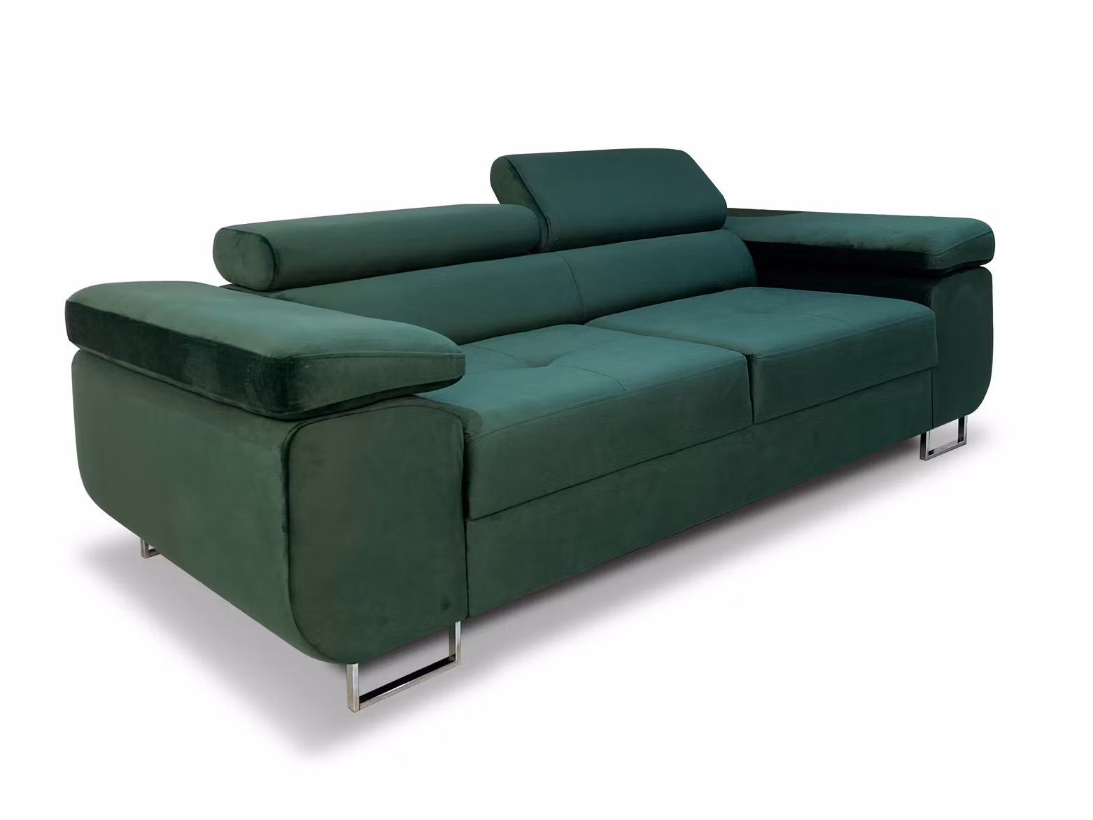 Vår 2-sitsiga gröna soffa Andre är det perfekta valet för ditt hem. Kommer med sammetstyg och justerbara nackstöd för funktionalitet.