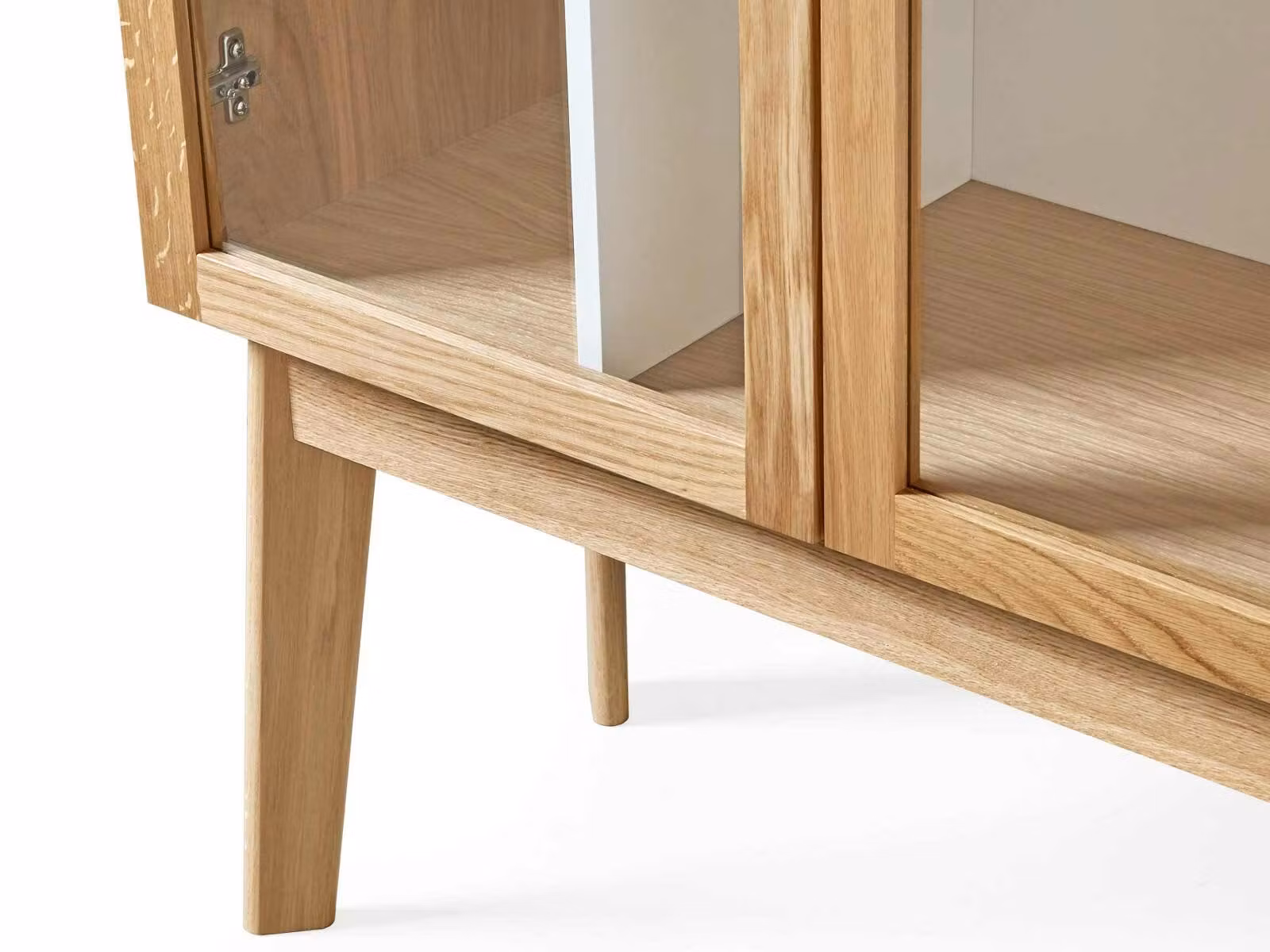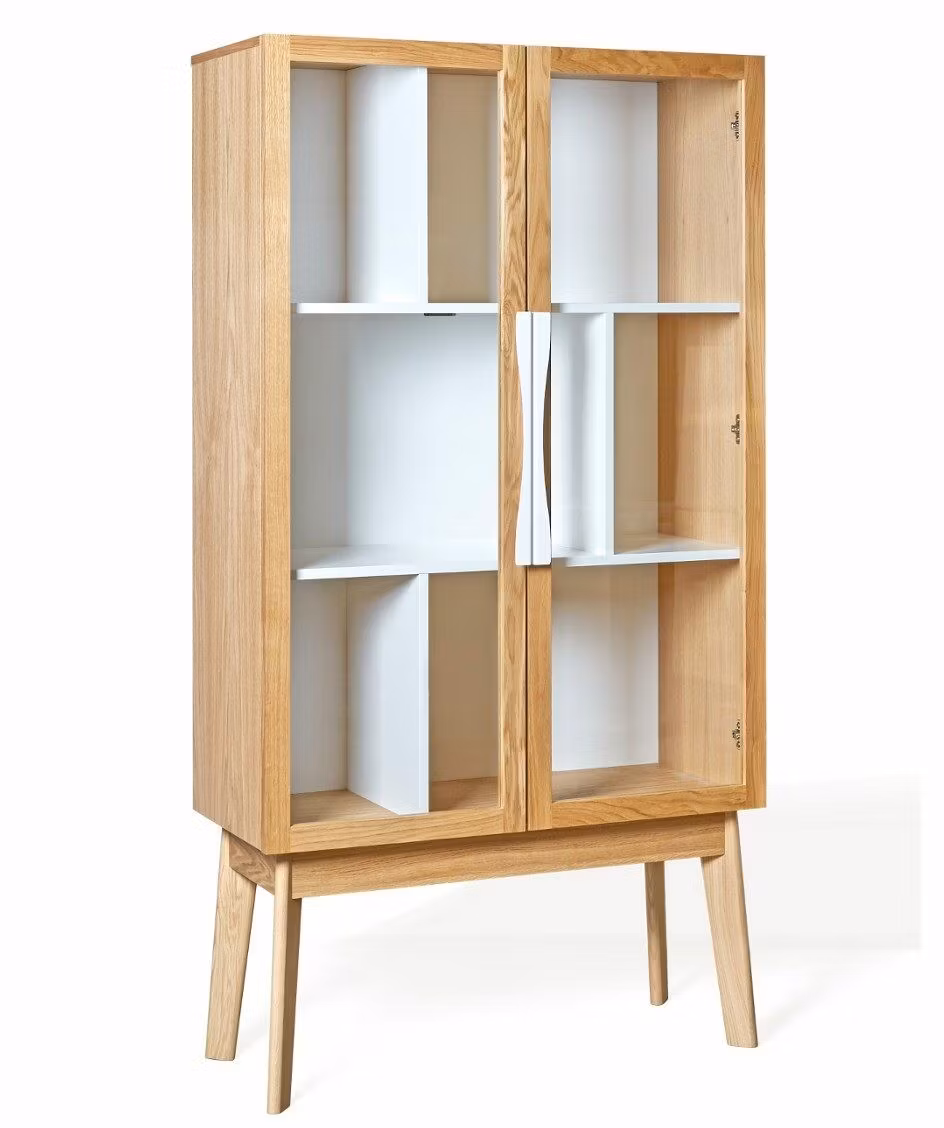 Vackert utformad vitrinskåp med ben i massiv ek.