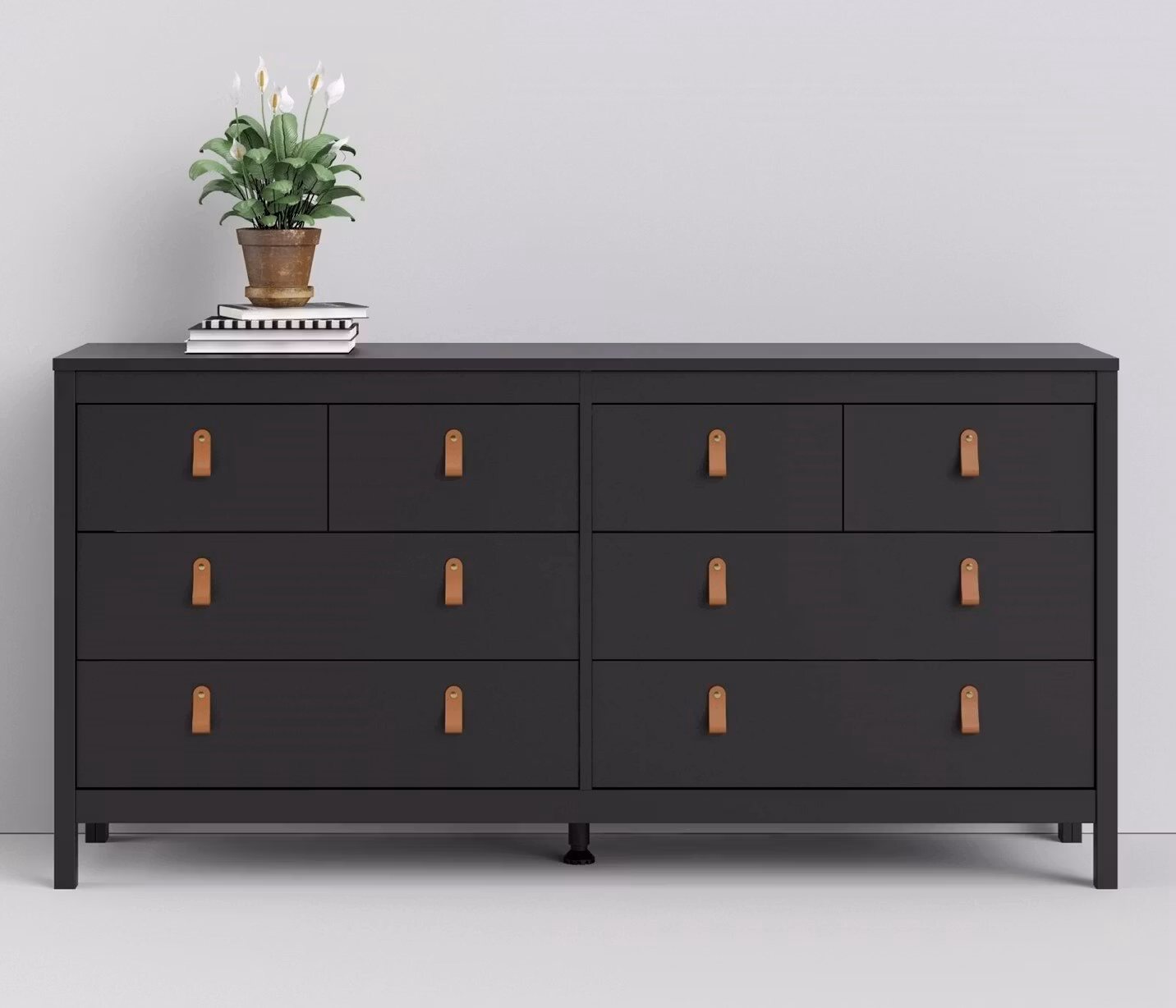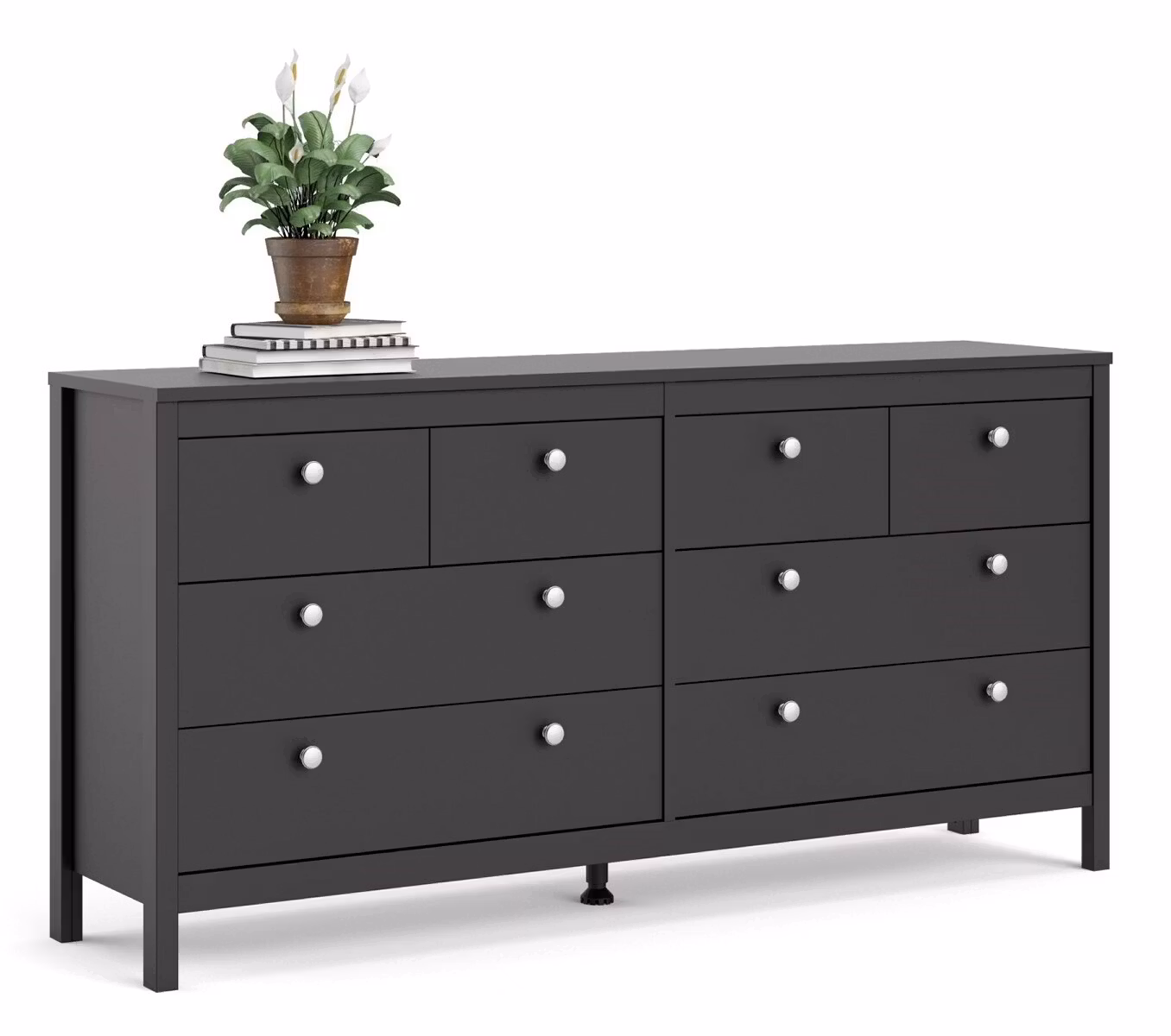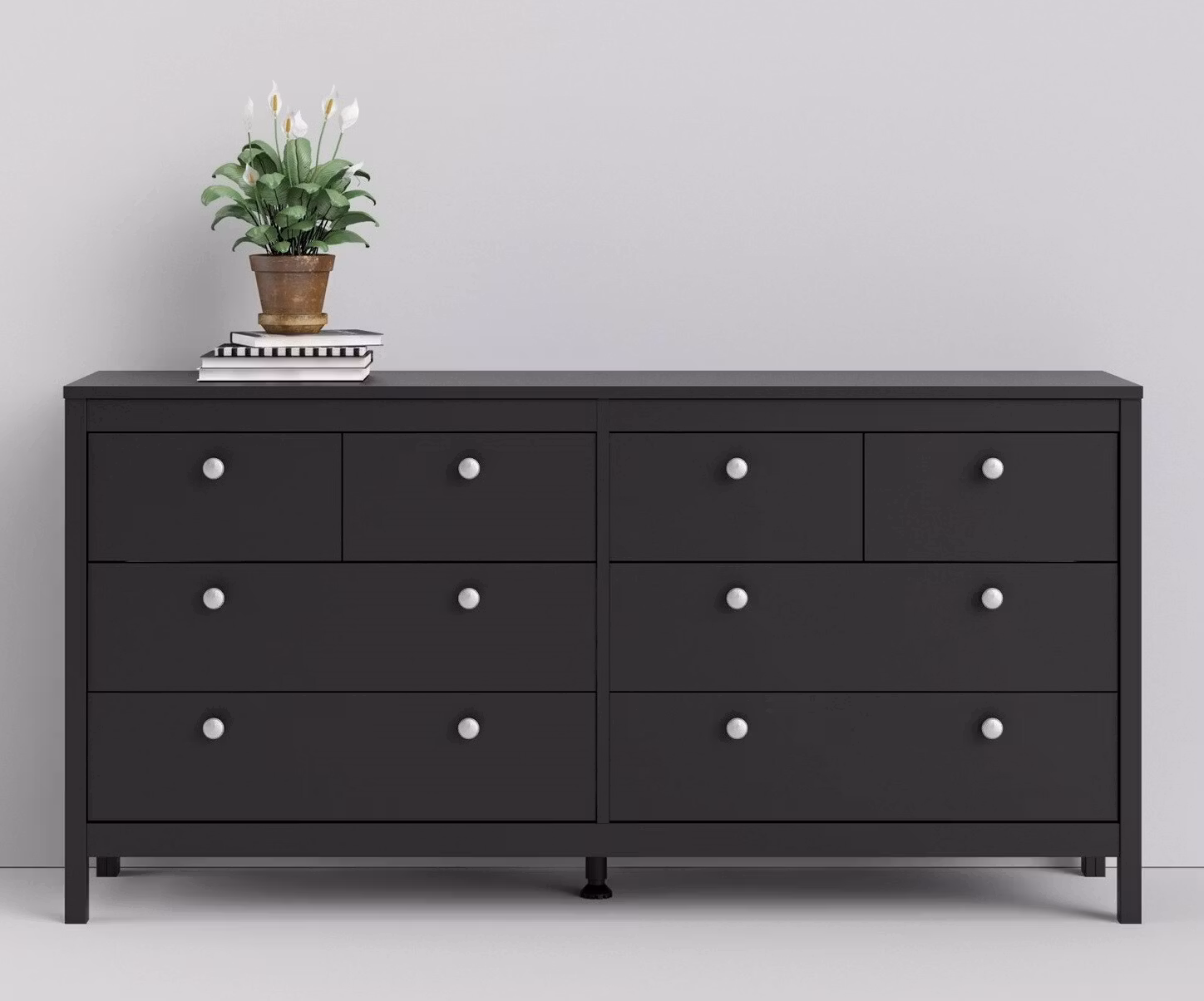 BLACK MADRID Byrå med 8 lådor Höjd: 80 cm, bredd: 159,5 cm, djup: 38,5 cm. Basmaterial: möbelskiva, finishfolie, man får 2 typer av handtag. Färg: sv