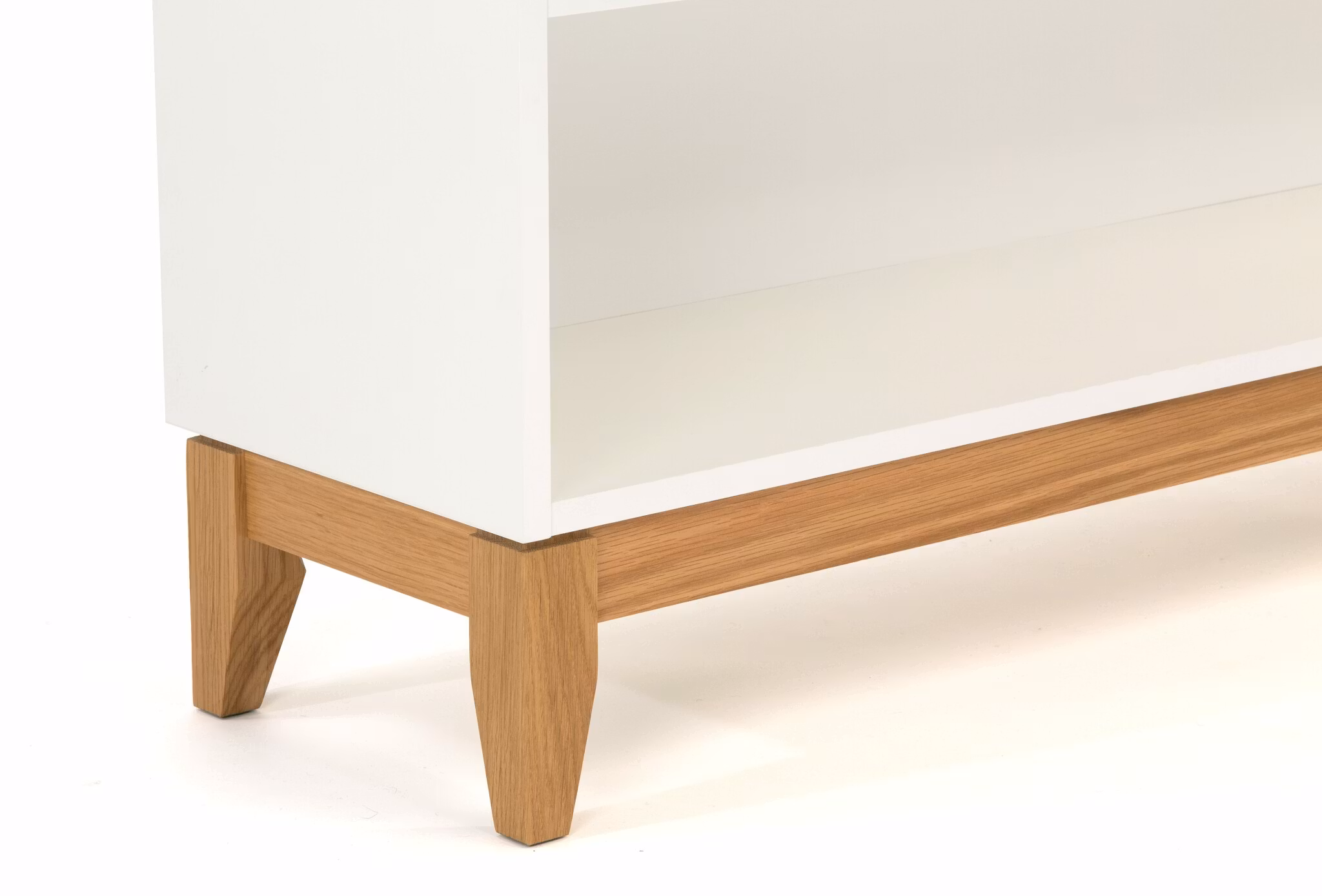 Modern och praktiskt vit skänk med mycket förvaringsutrymme. En möbel som passar i flera stilar och därför lämpar sig för både moderna och klassiska hem.