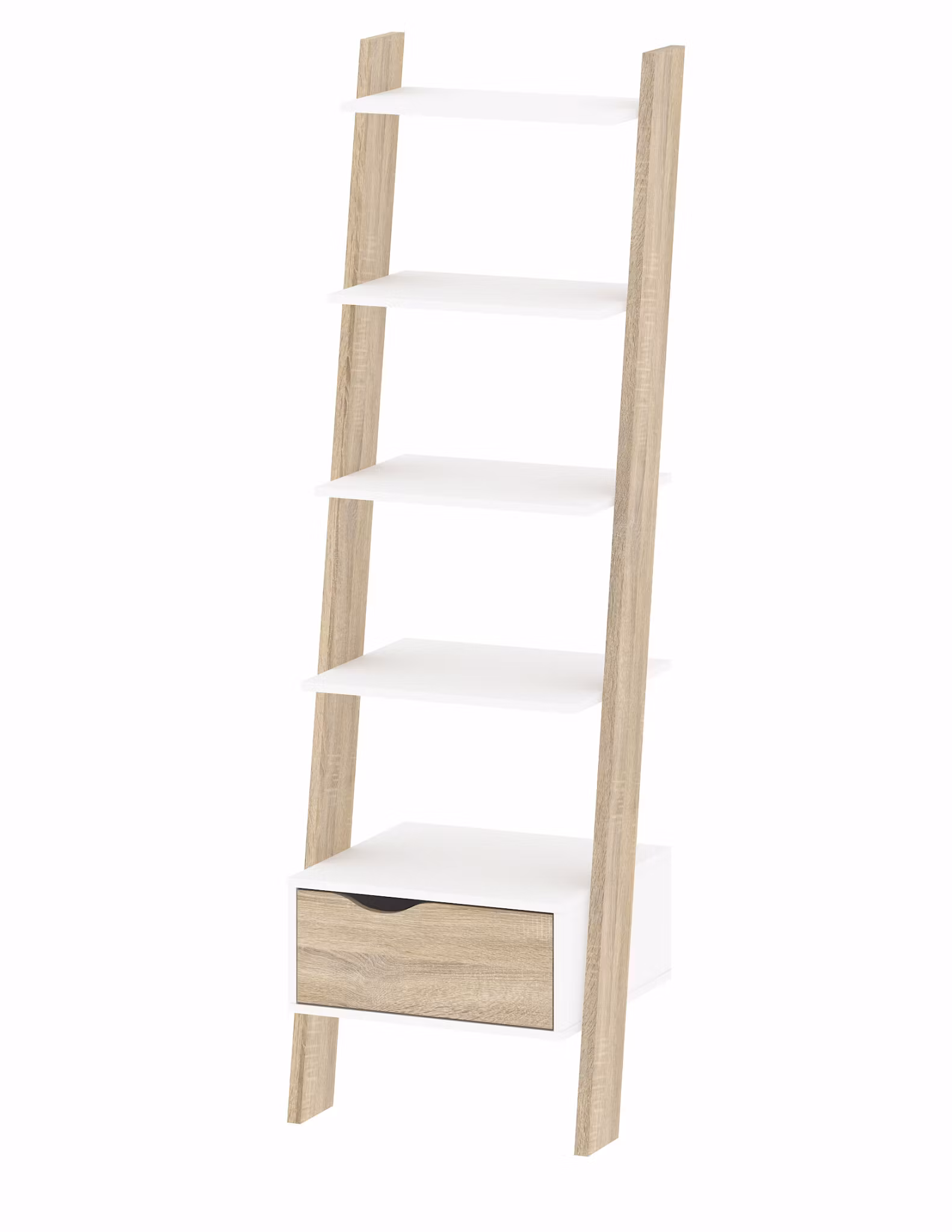 DELTA V 75385 Steghylla med 1 låda Höjd: 180,5 cm, bredd: 55,5 cm, djup: 48 cm. Basmaterial: möbelskiva, finishfolie. Färg: vit / ek. Skötselråd: