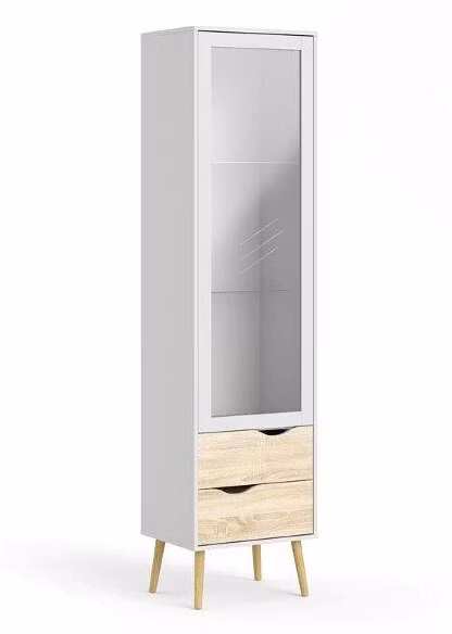 DELTA V 75461 Vitrinskåp med 1 glasdörr och 2 lådor Höjd: 200 cm, bredd: 50,5 cm, djup: 39 cm. Basmaterial: möbelskiva, finishfolie. Färg: vit / ek.