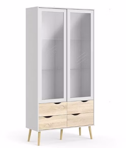 DELTA V 75462 Vitrinskåp med 2 glasdörr och 2 lådor Höjd: 200 cm, bredd: 99 cm, djup: 39 cm. Basmaterial: möbelskiva, finishfolie. Färg: vit / ek. S