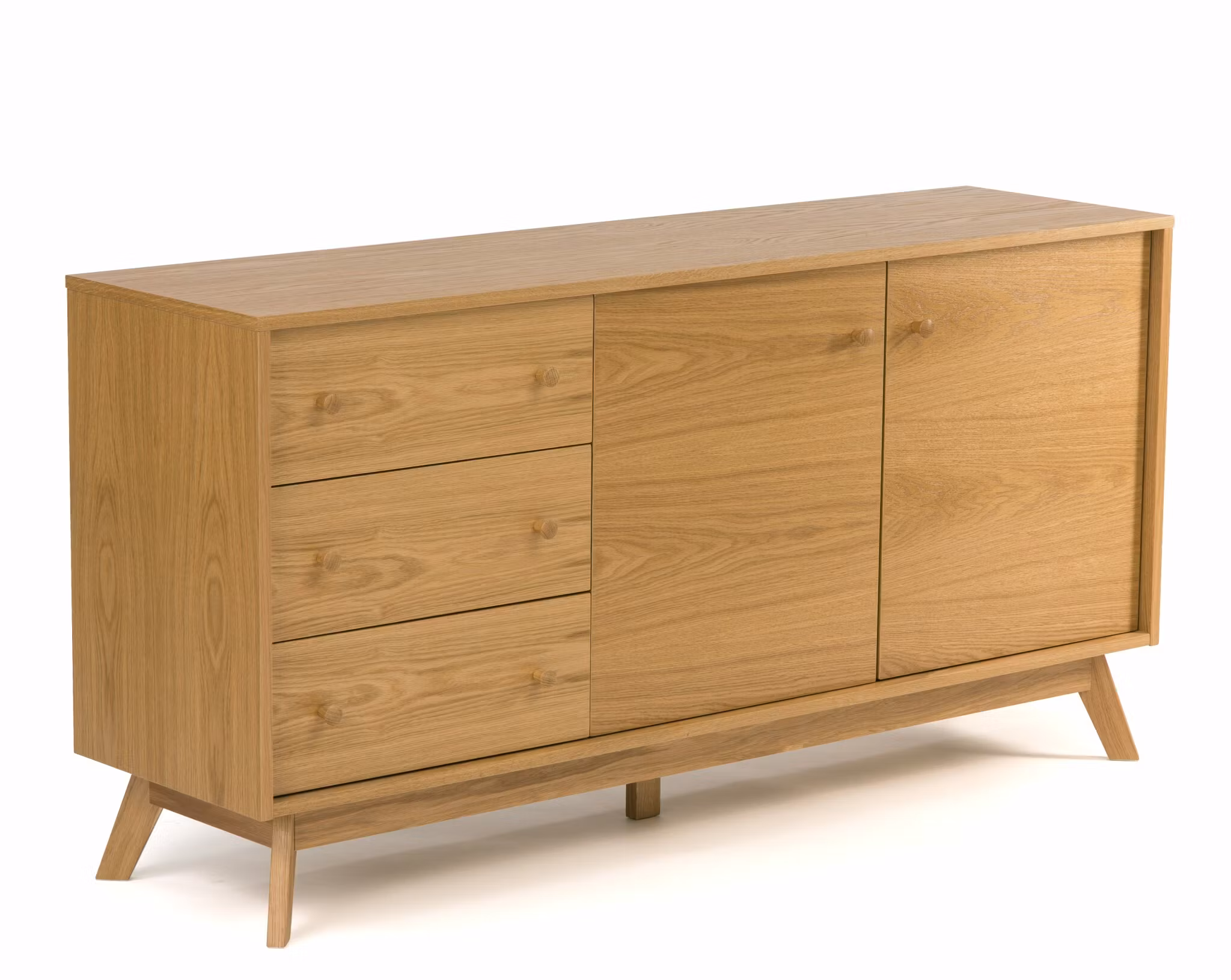 En trevlig skänk i ljust trä som bäst kombinerar design och optimal förvaring. Skänkens design kompletteras med läckra ben och handtag i massiv ek. En skänk som gör bra i designmedvetna hem.