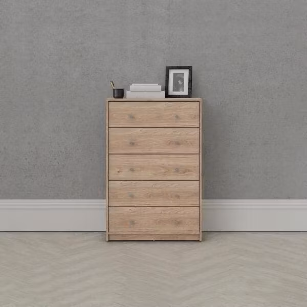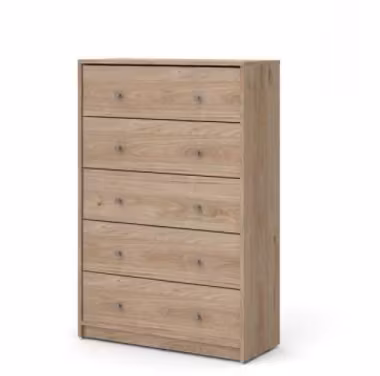 MAY 70329 HICKORY Byrå med 5 lådor Höjd: 108 cm, bredd: 72,5 cm, djup: 30 cm. Basmaterial: möbelskiva, melaminfolie. Skötselråd: torka med en trasa fuk