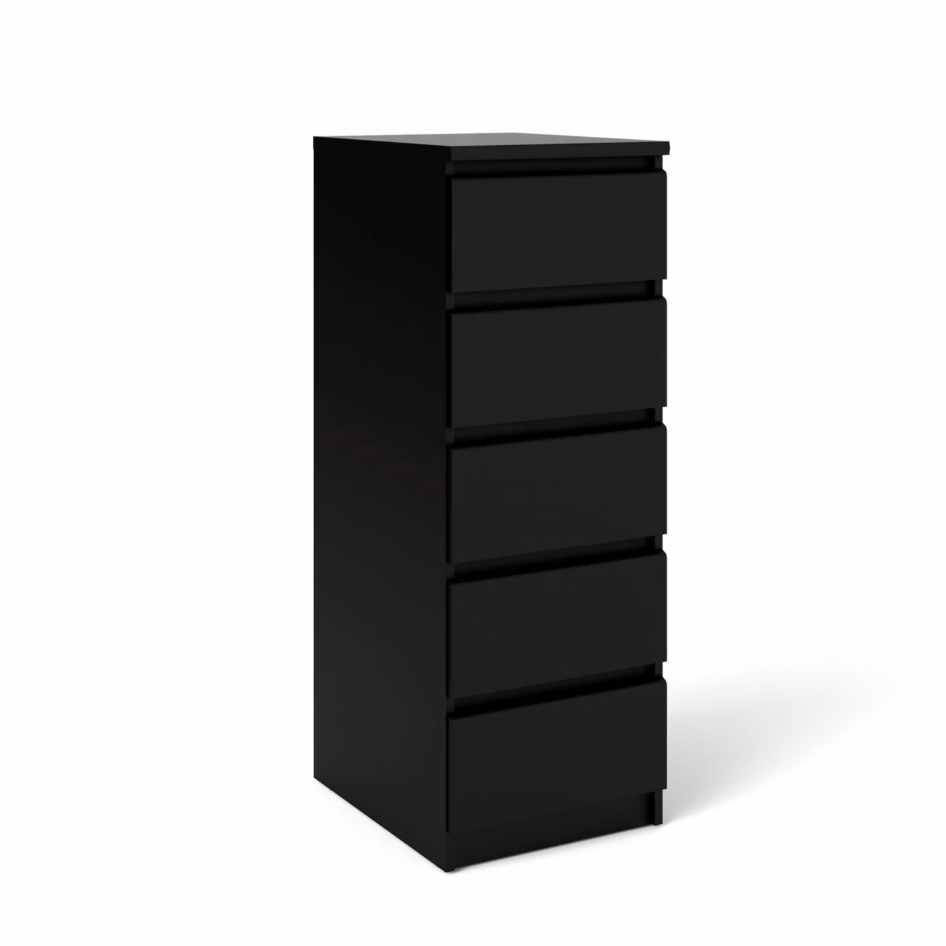 NAIA 76233 SVART Byrå med 5 lådor Höjd: 111,5 cm, bredd: 40,5 cm, djup: 50 cm. Basmaterial: möbelskiva, finishfolie. Skötselråd: Torka med en trasa fuk