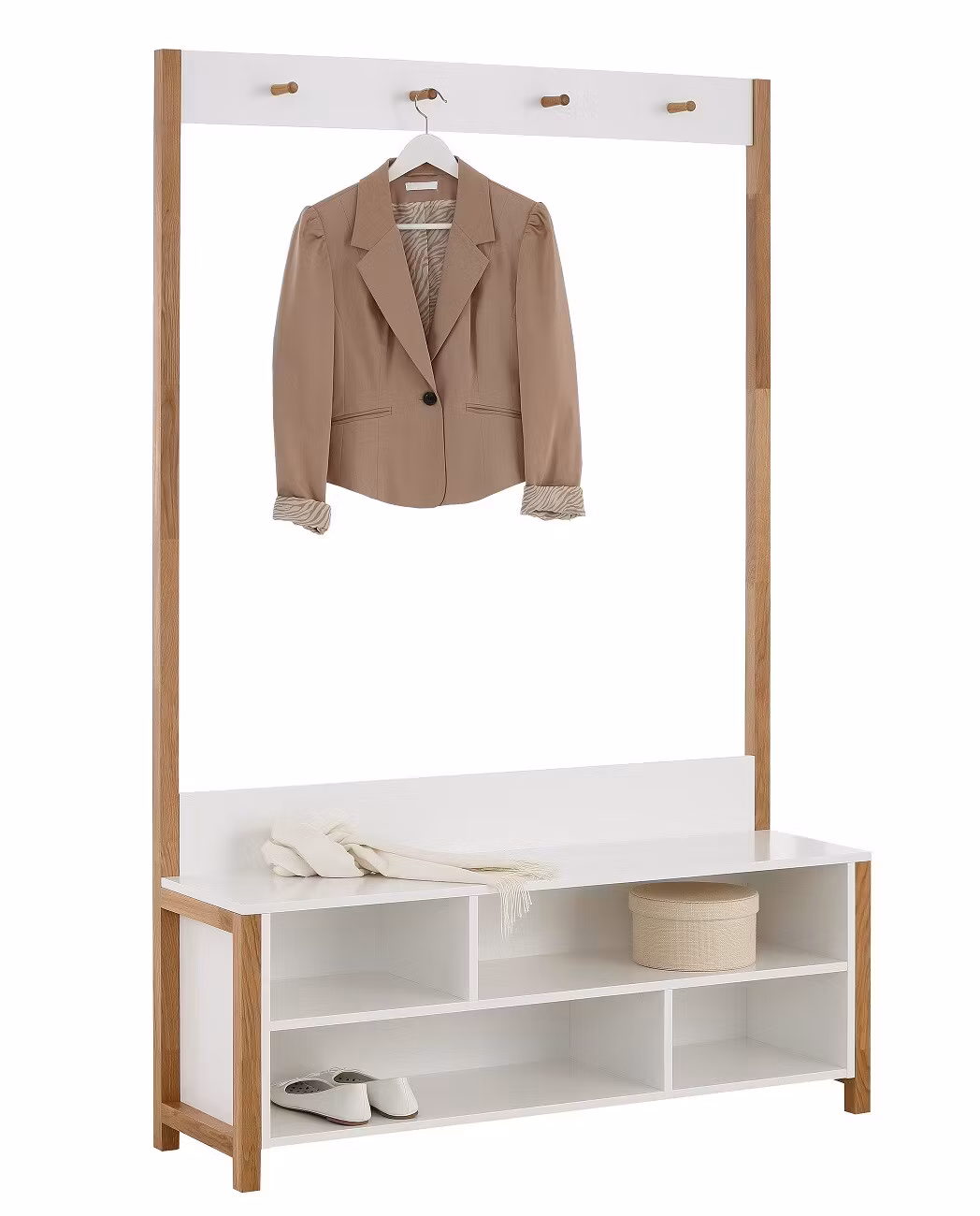 Smart vit bänk med praktiska hyllor och klädhängare. Bänken är vit och har ben och ram i massiv ek. En läcker och bekväm bänk för moderna hem.