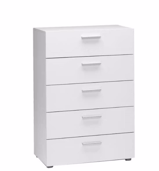 PEPE 70072 VIT Byrå med 5 lådor Höjd: 102 cm, bredd: 70 cm, djup: 40,5 cm. Basmaterial: möbelskiva, melaminfolie. Skötselråd: torka med en trasa fuktad