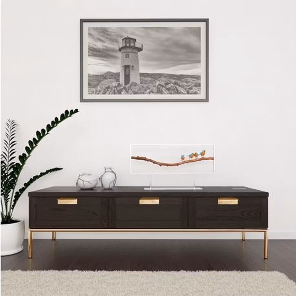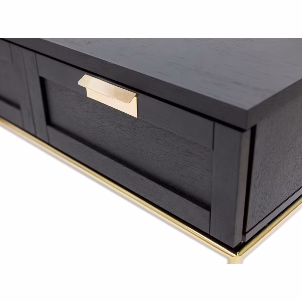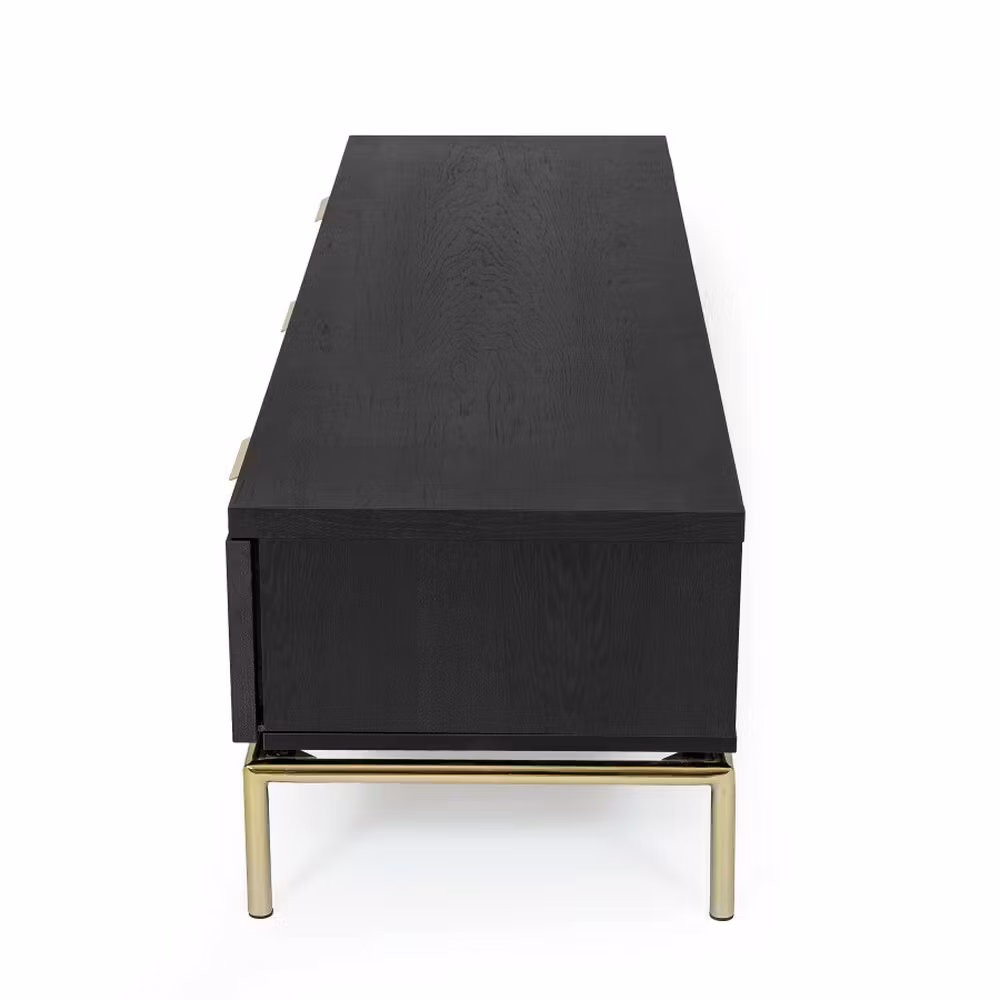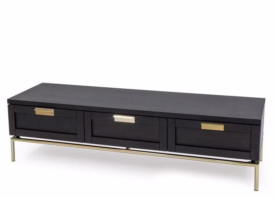 Höjd: 40 cm, bredd: 150 cm, djup: 44 cm Stomme och dörrar är fanerade, täckt med träkol färg och matt klar lack. Ram är tillverkad av guldfärgad metall (d22m