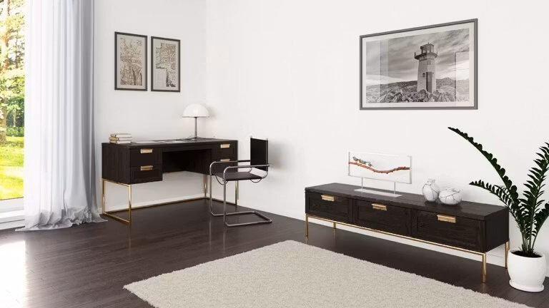 Stomme och dörrar är fanerade, täckt med träkol färg och matt klar lack. Ram är tillverkad av guldfärgad metall (d22mm), metallhandtag och metalldelar belagda med glänsande mässing.