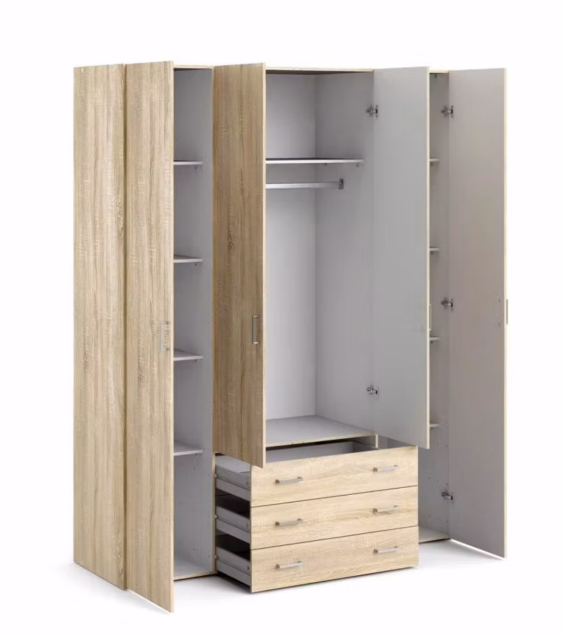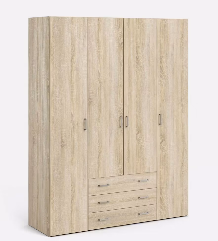 SPACE 70410 EK Garderob med 4 dörrar och 3 lådor Höjd: 200,5 cm, bredd: 154 cm, djup: 49,5 cm. Basmaterial: möbelskiva, melaminfolie. Dessa produkter