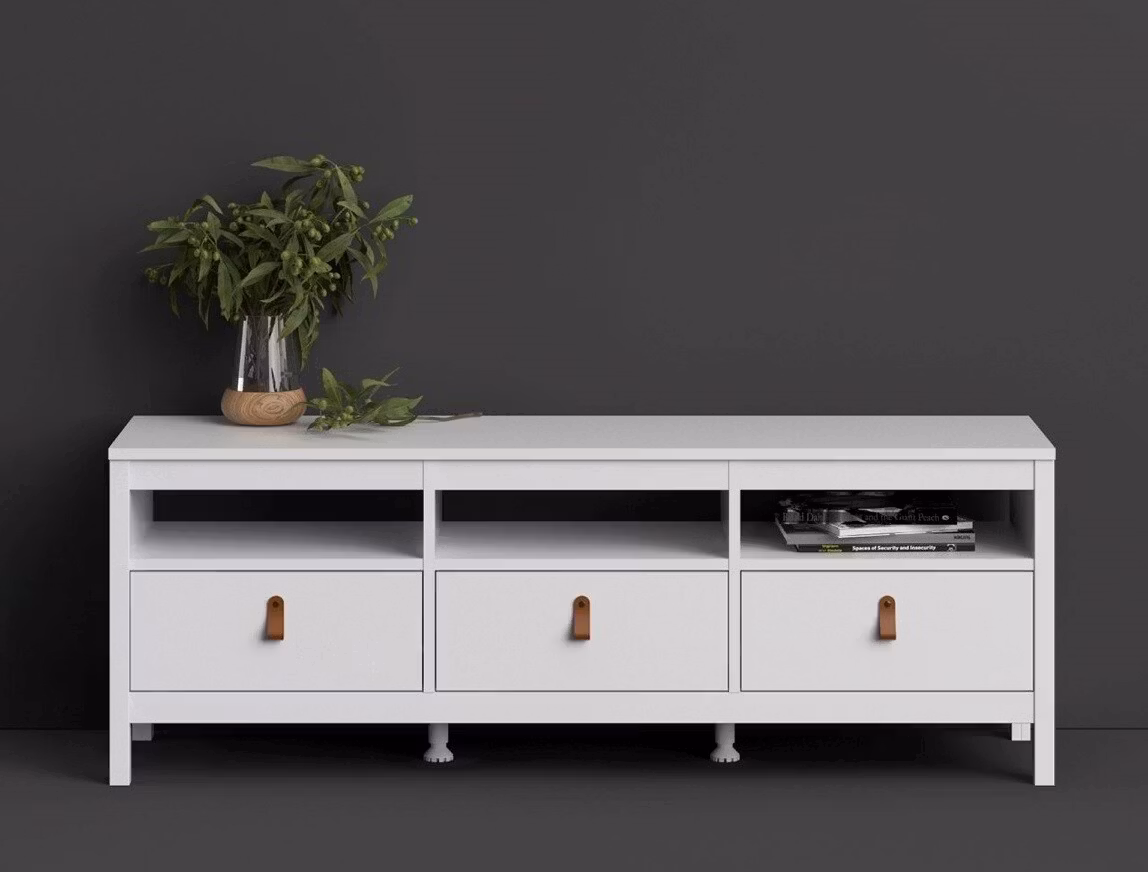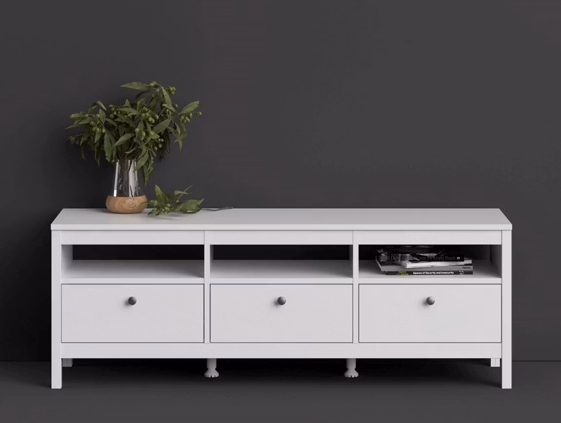 WHITE MADRID Tv-bänk med 3 lådor Höjd: 54 cm, bredd: 151,5 cm, djup: 38,5 cm. Basmaterial: möbelskiva, finishfolie, man får 2 typer av handtag. Skö